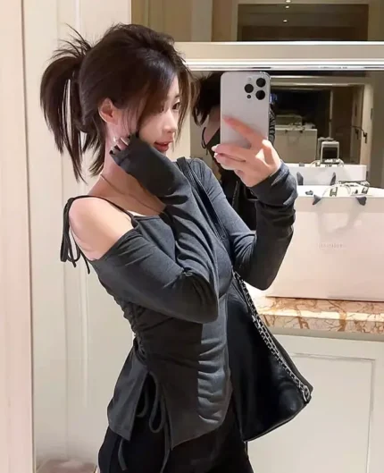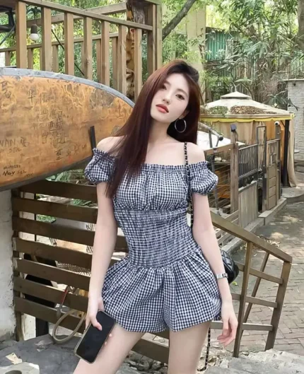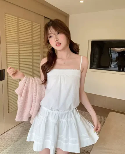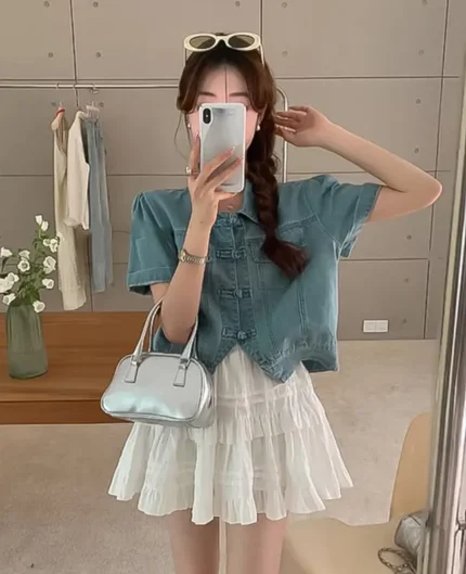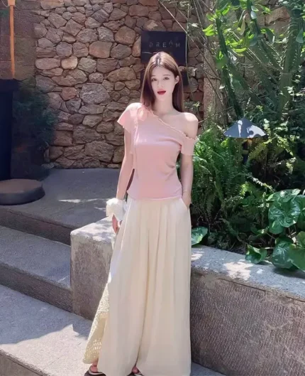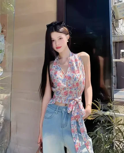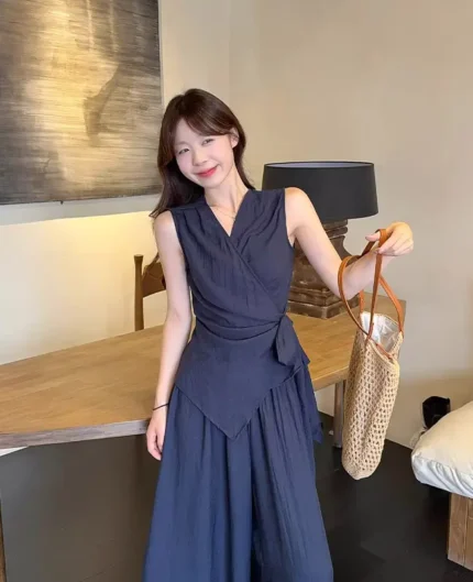 美式吊帶+高腰闊腿長褲兩件式牛仔套裝