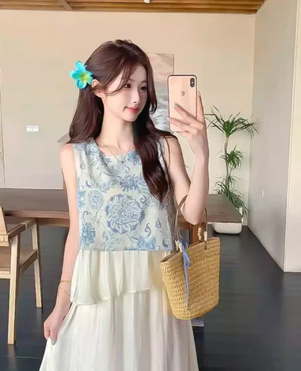 小碎花吊帶娃娃+長袖上衣兩件套Set