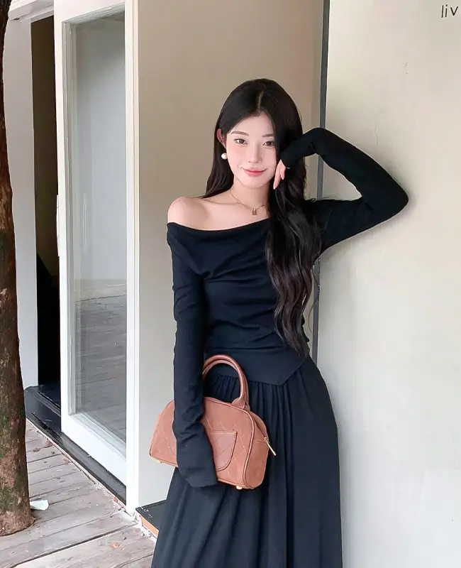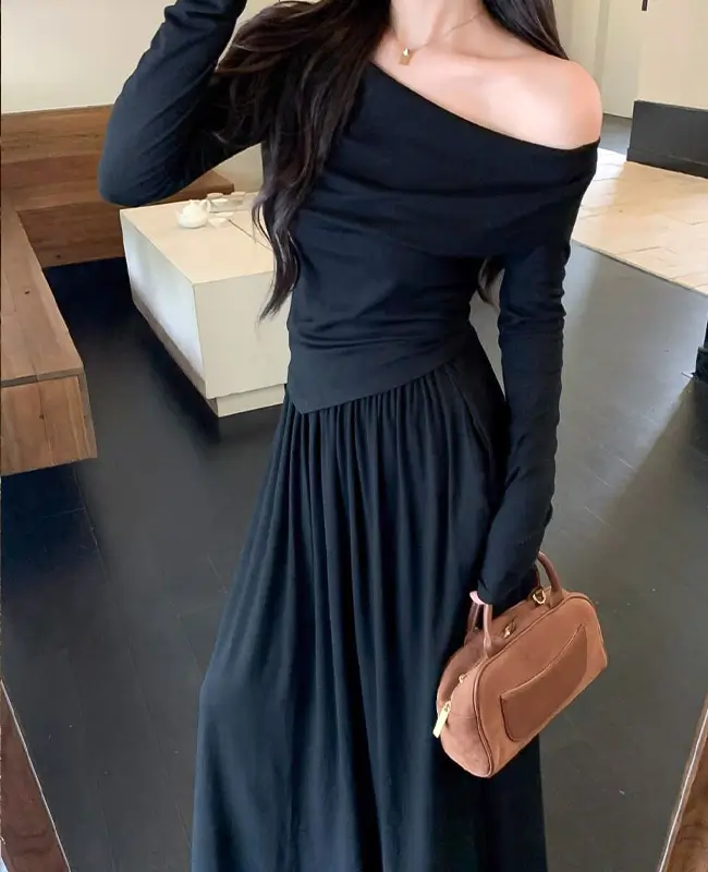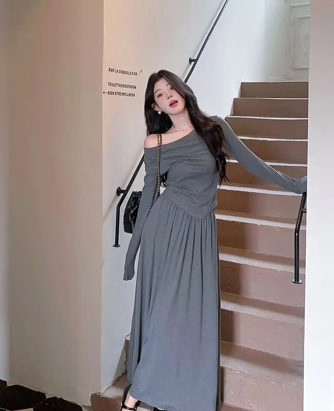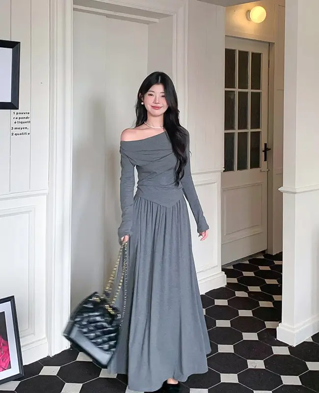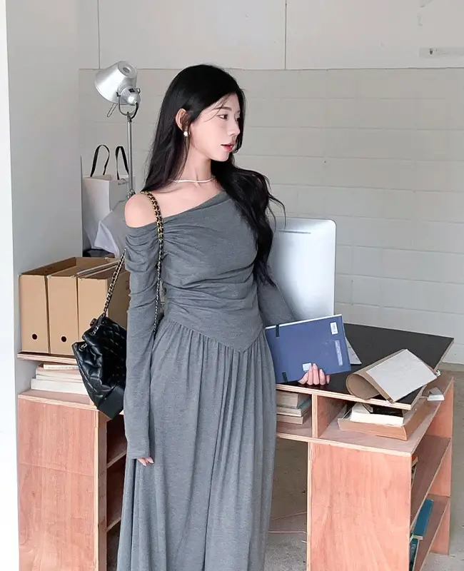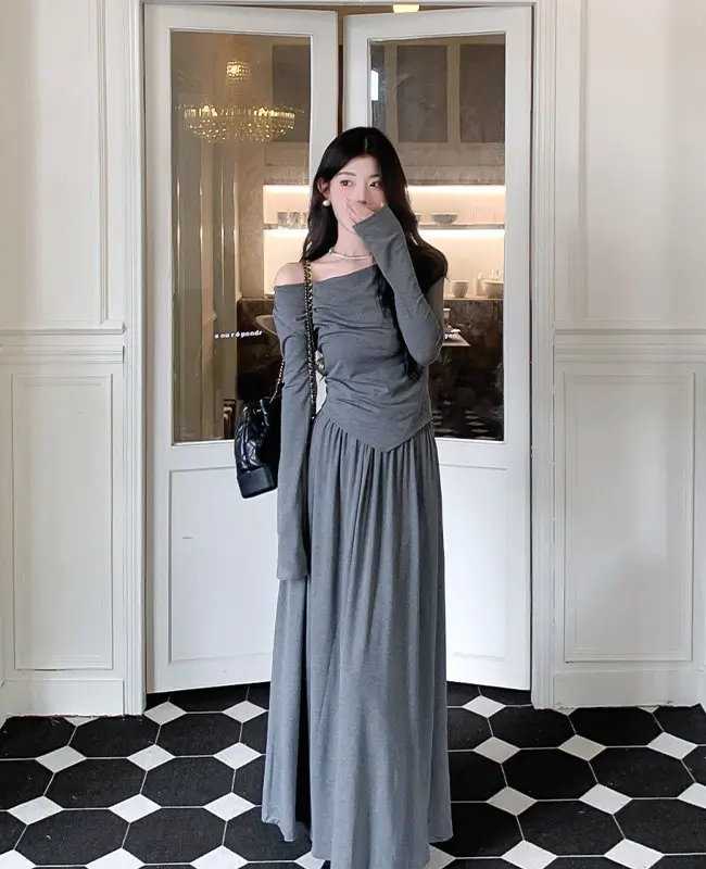 斜肩上衣+鬆緊腰長裙兩件式套裝Set