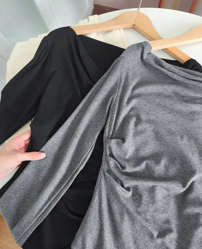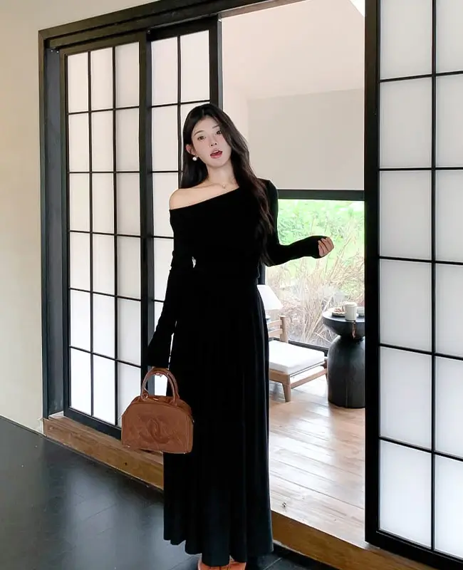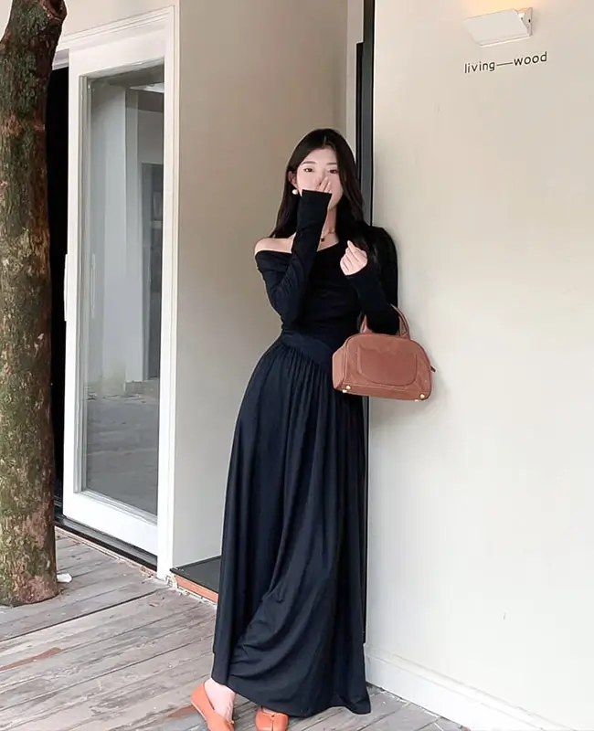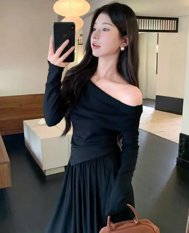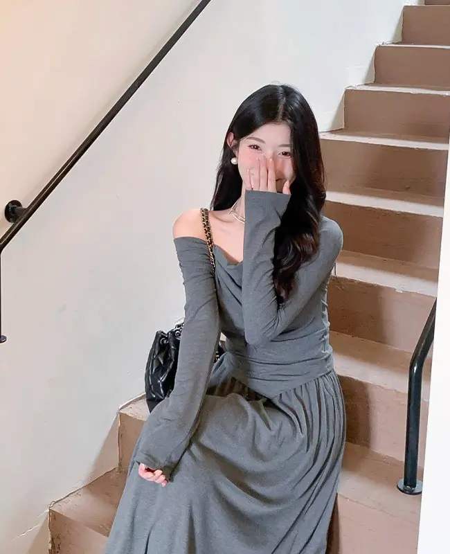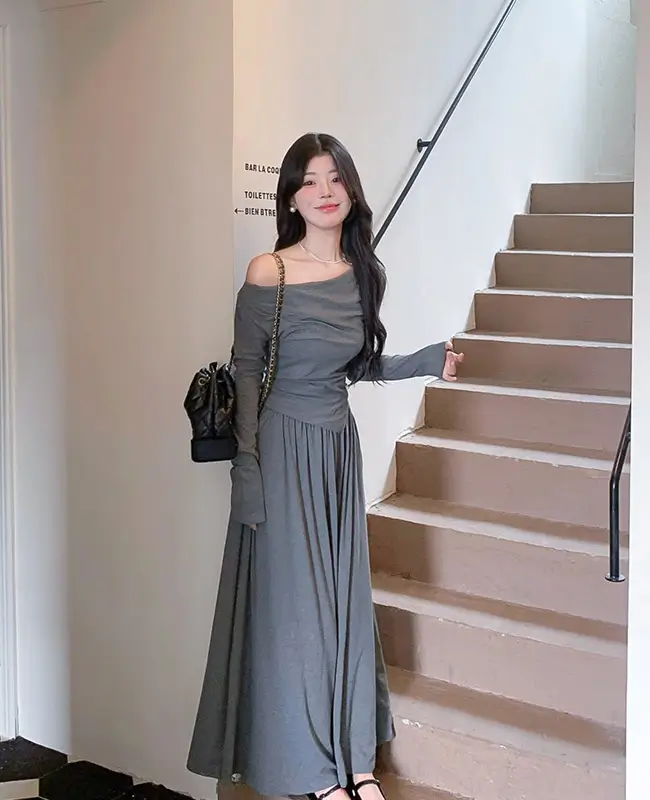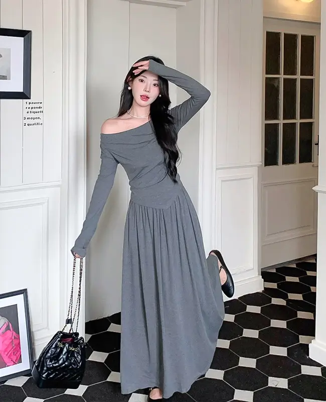 斜肩上衣+鬆緊腰長裙兩件式套裝Set