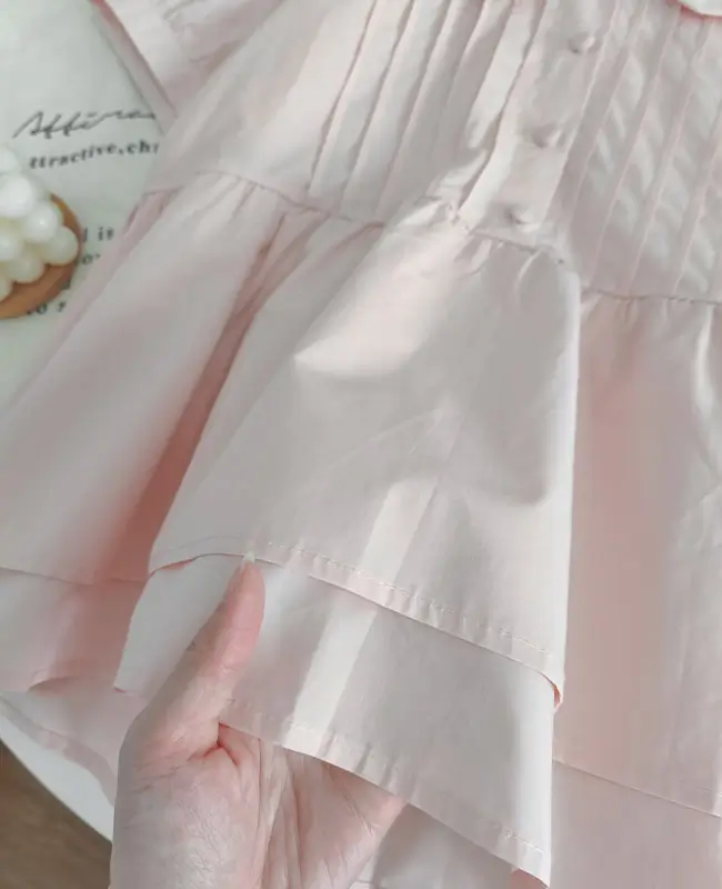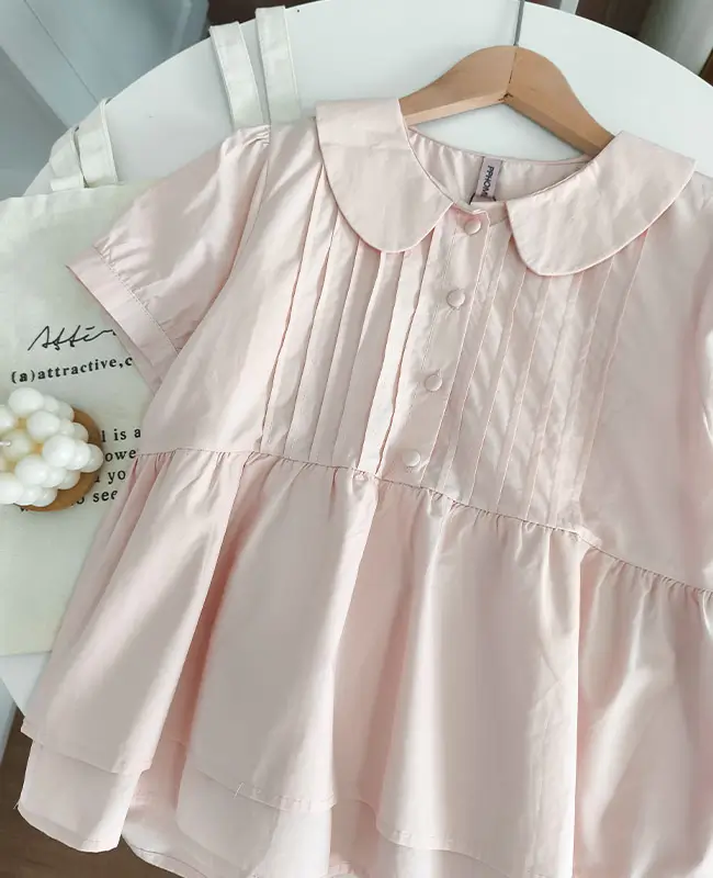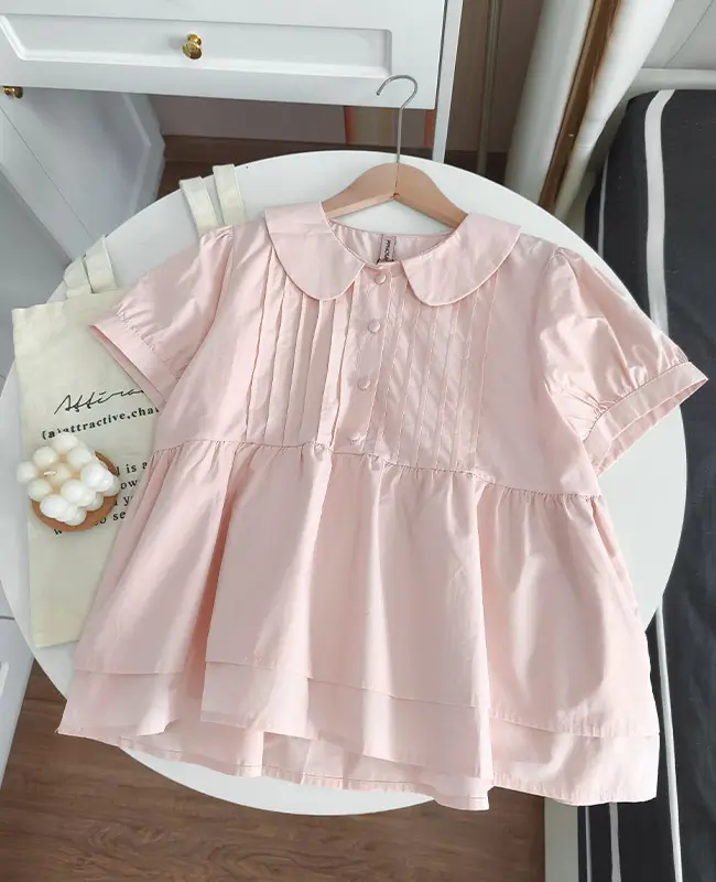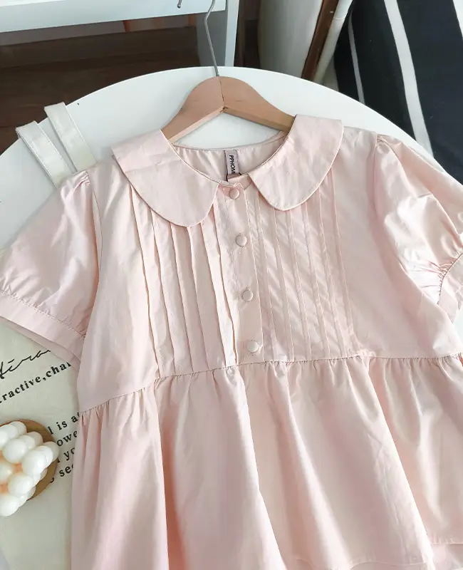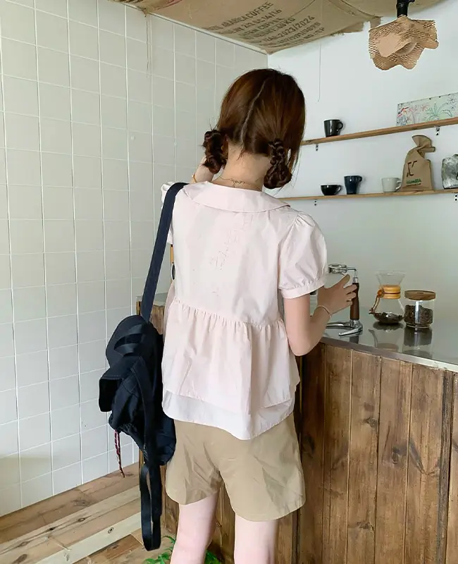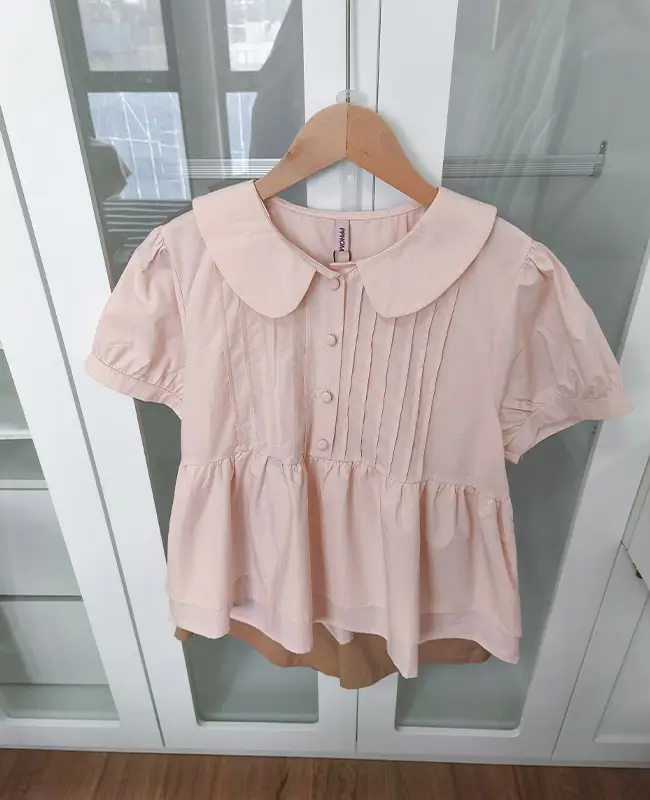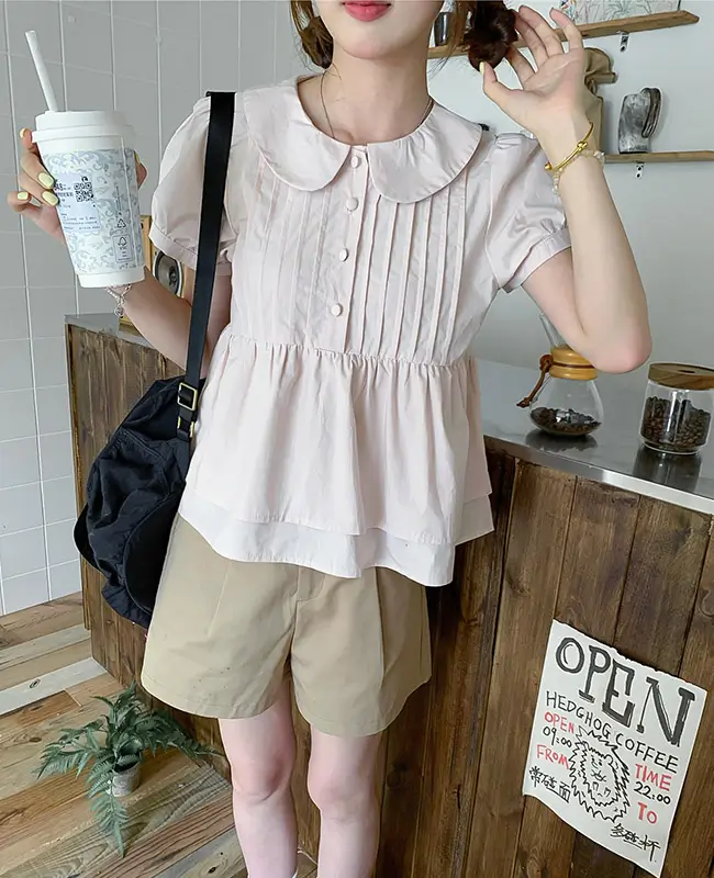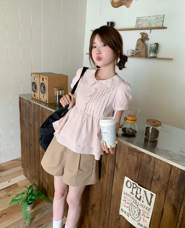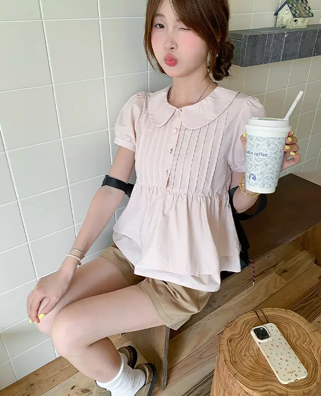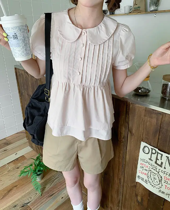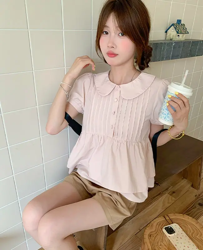 娃娃領壓褶蓬袖上衣