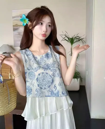 小碎花吊帶娃娃+長袖上衣兩件套Set